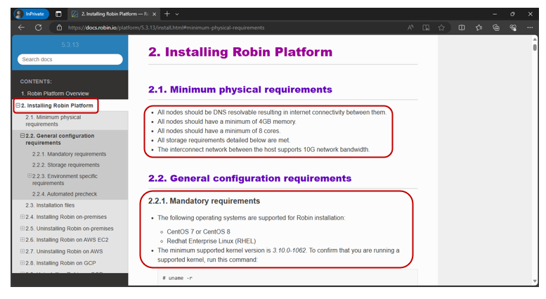 To check the prerequisites, click on Installing Robin Platform. Under this option, we will find all the prerequisites which we have mentioned in the previous sections.